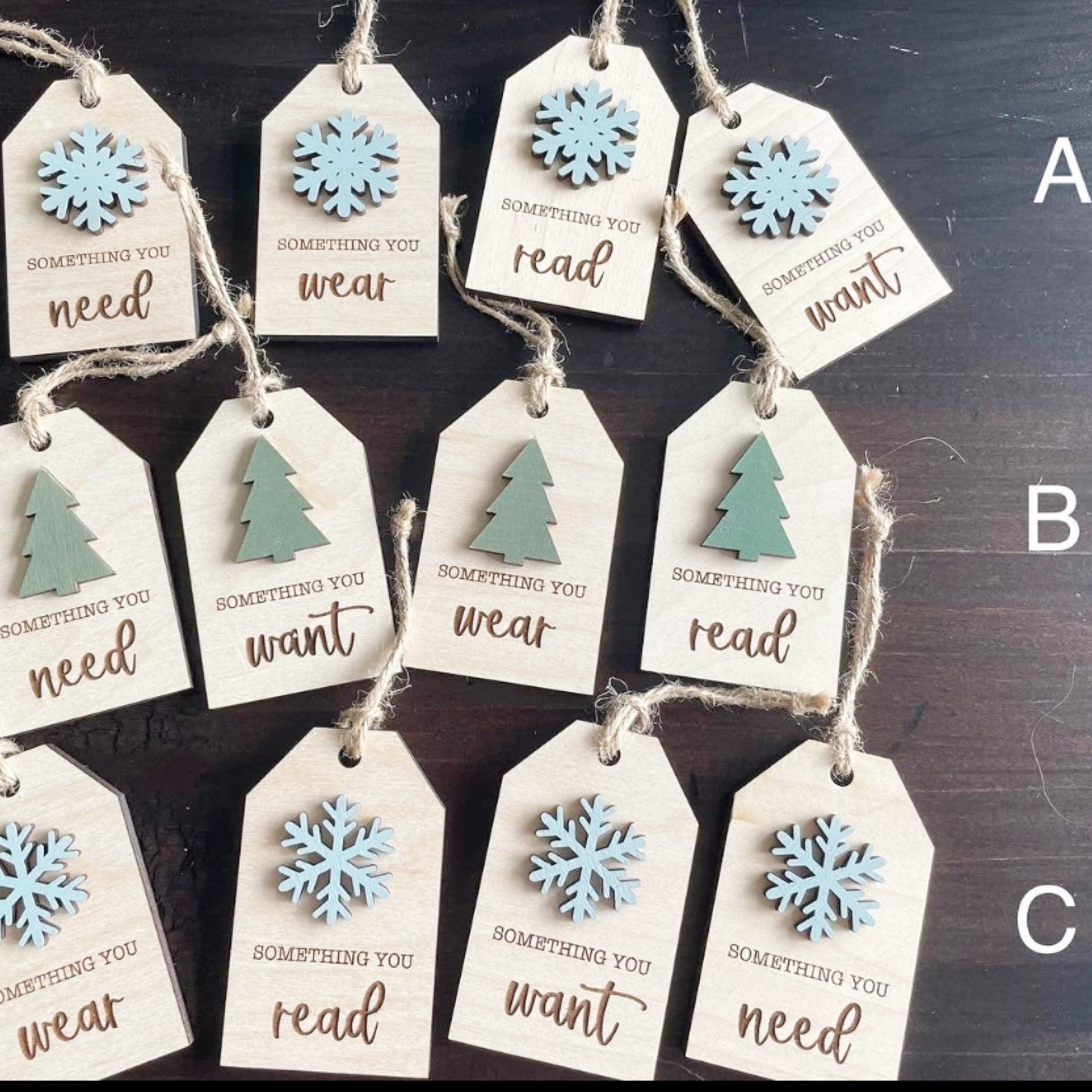 They come in sets of 4 and you choose which design you’d like. There are two different snow flakes or a tree theme.