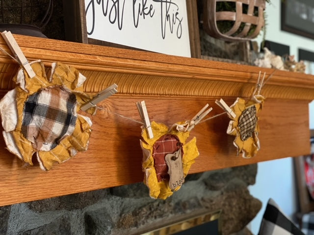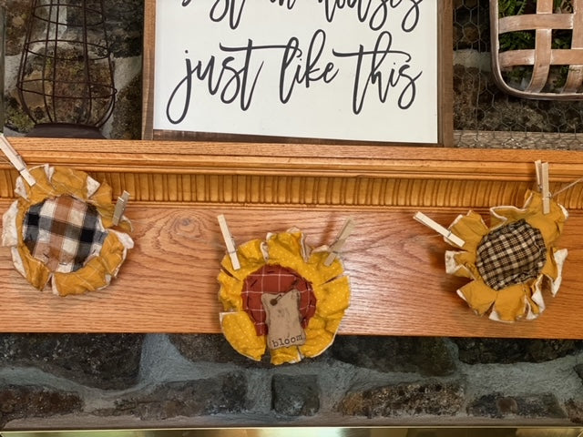 We have a few different options to order these sunflowers. There is the trio tied together in a mason jar, a trio strung together to make a banner or a single sunflower on a stick with a rusty old bed spring to hold it up. Each way comes with at least one rusty safety pin and bell and stamped tag attached. Each flower measures about 7" around.