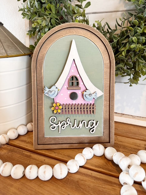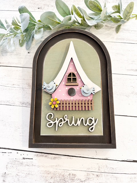 It measures 11.5x7.5 and will have lots of adorable arch interchangeable pieces to add to it in the future. This first one is this super cute SPRING BIRD HOUSE piece. It will be sold as a bundle that will include the arch, the easel that goes on the back, and the Spring interchangeable piece. Then in the future you'll be able to order the new interchangeable pieces to go with it. You can order the bundle with or without paint and you can choose to have black or brown paint add to your kit.