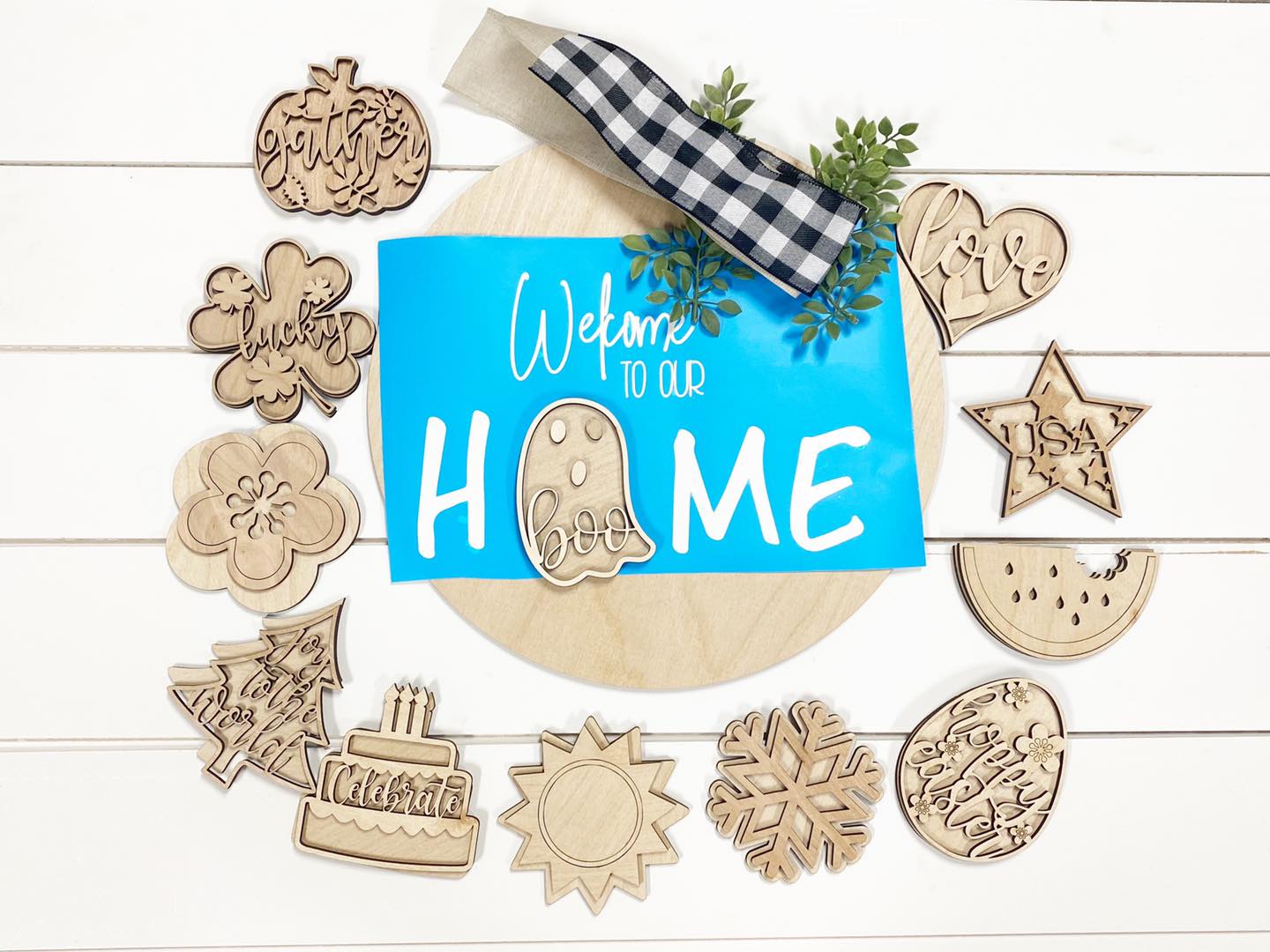 The Round Interchangeable Sign for all seasons- it measures 15" around and includes 12 interchangeable pieces.