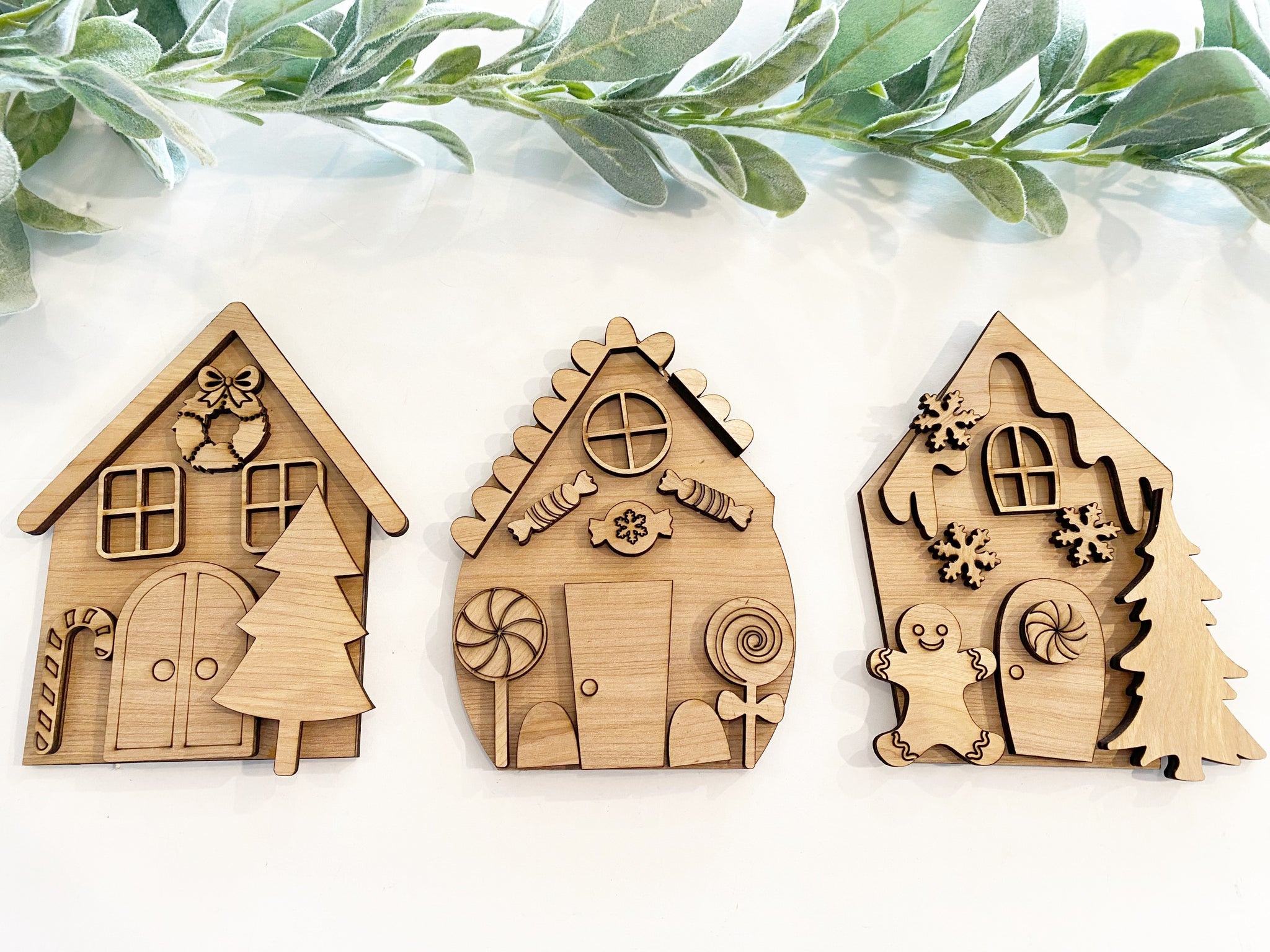 All wood pieces shown, three houses, add on pieces and stands.