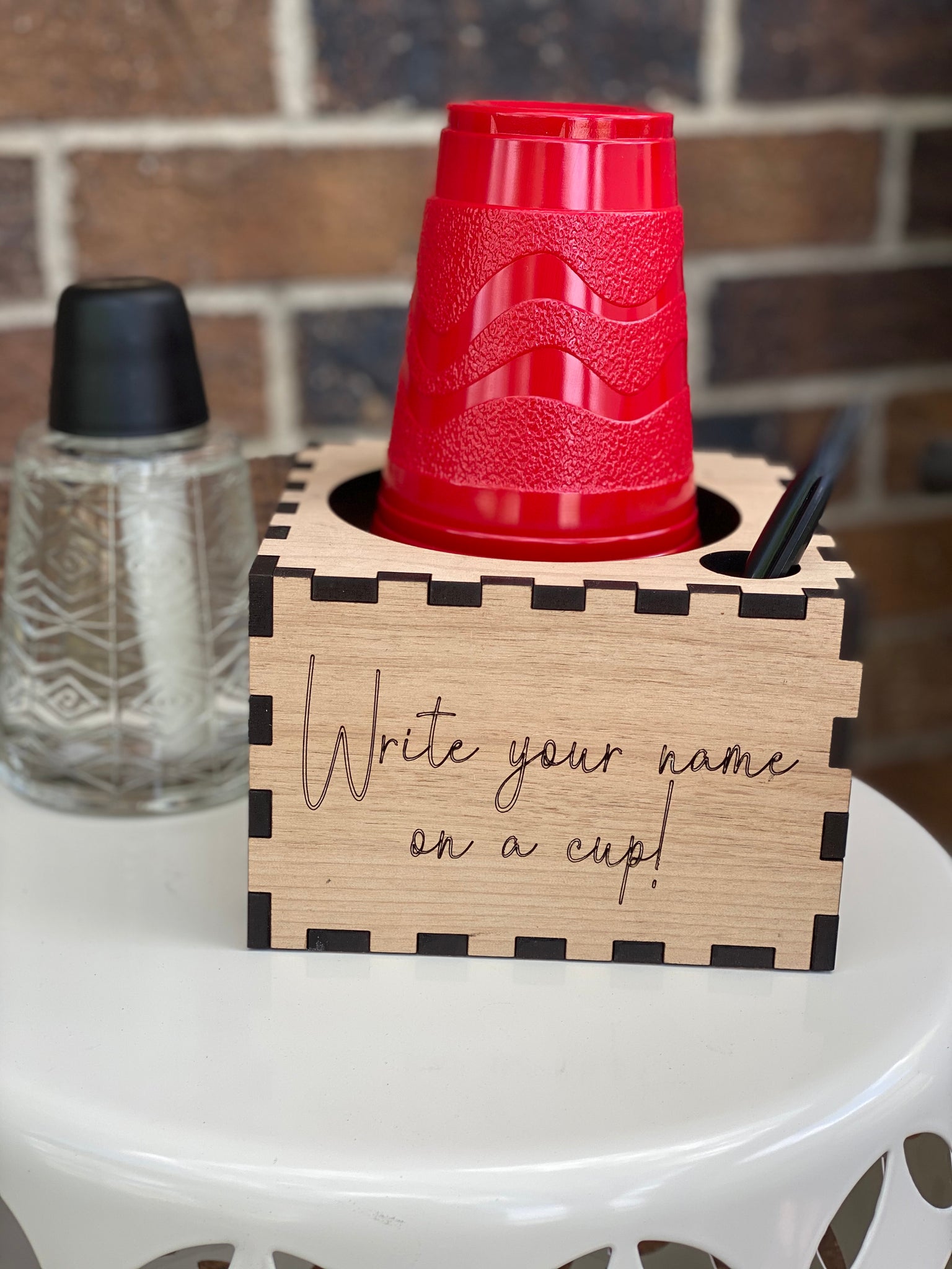 This laser cut box is perfect to hold your party cups and a marker for your guests to write their name on their cup.