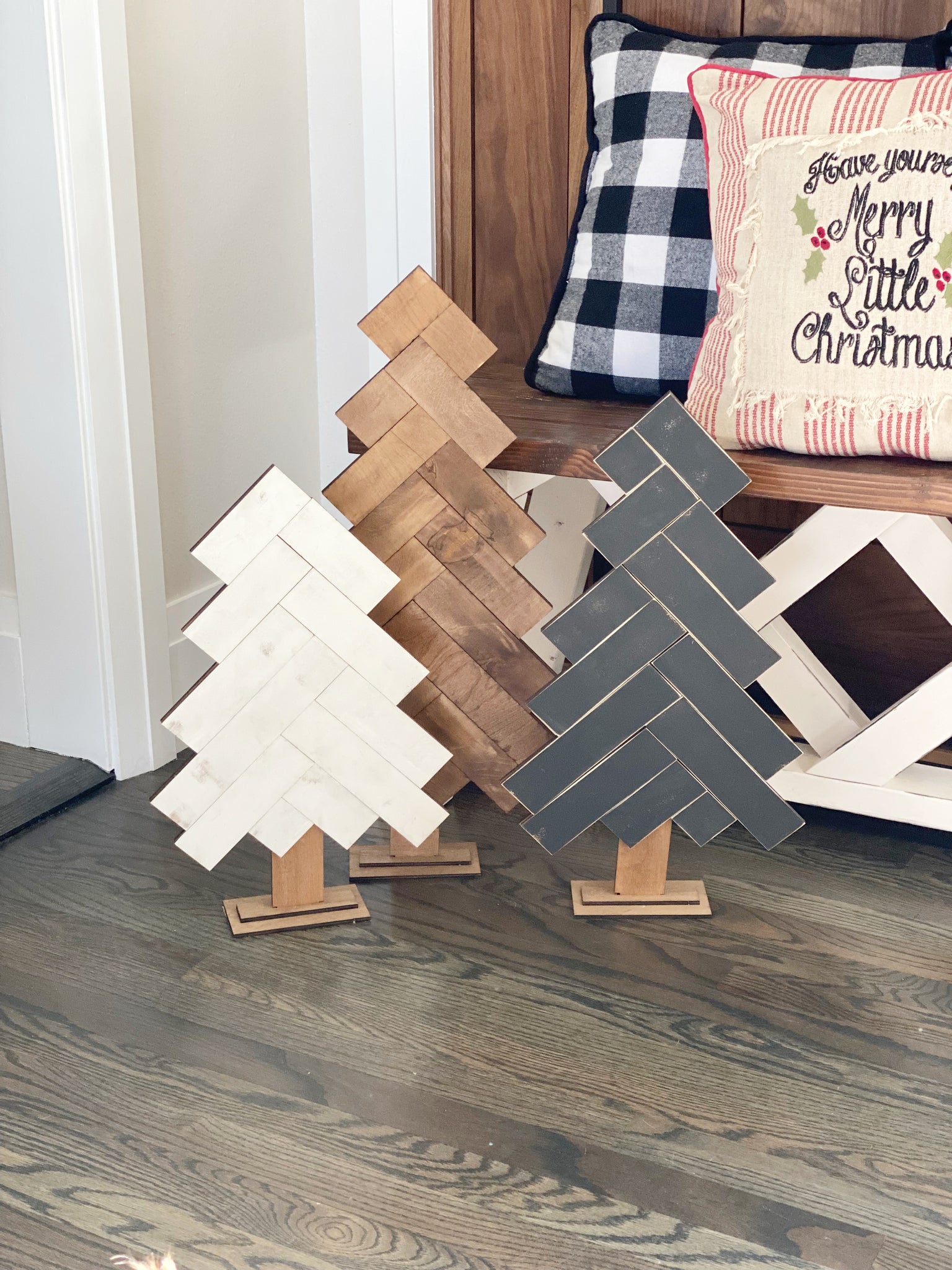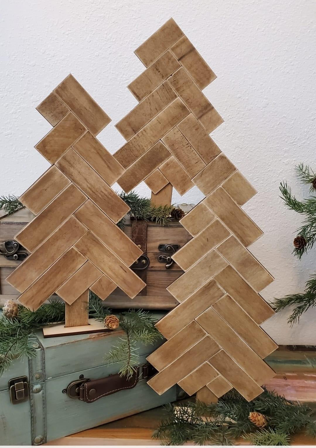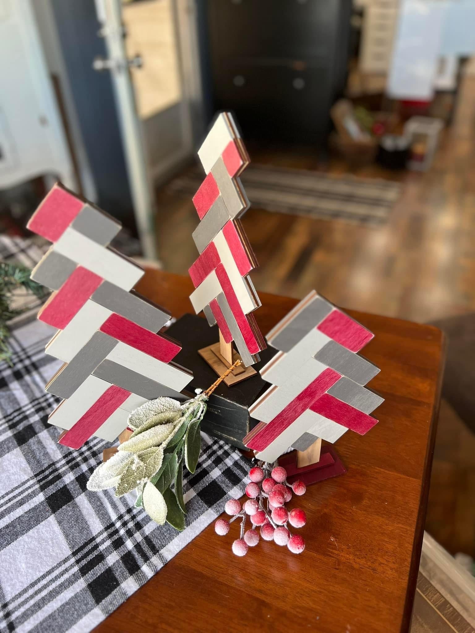 The trees measure 25,21 and 18” tall. You can paint or stain them in any color combination you’d like or bring your favorite scrapbook paper to use to decorate them as well. We will supply the mod posher.